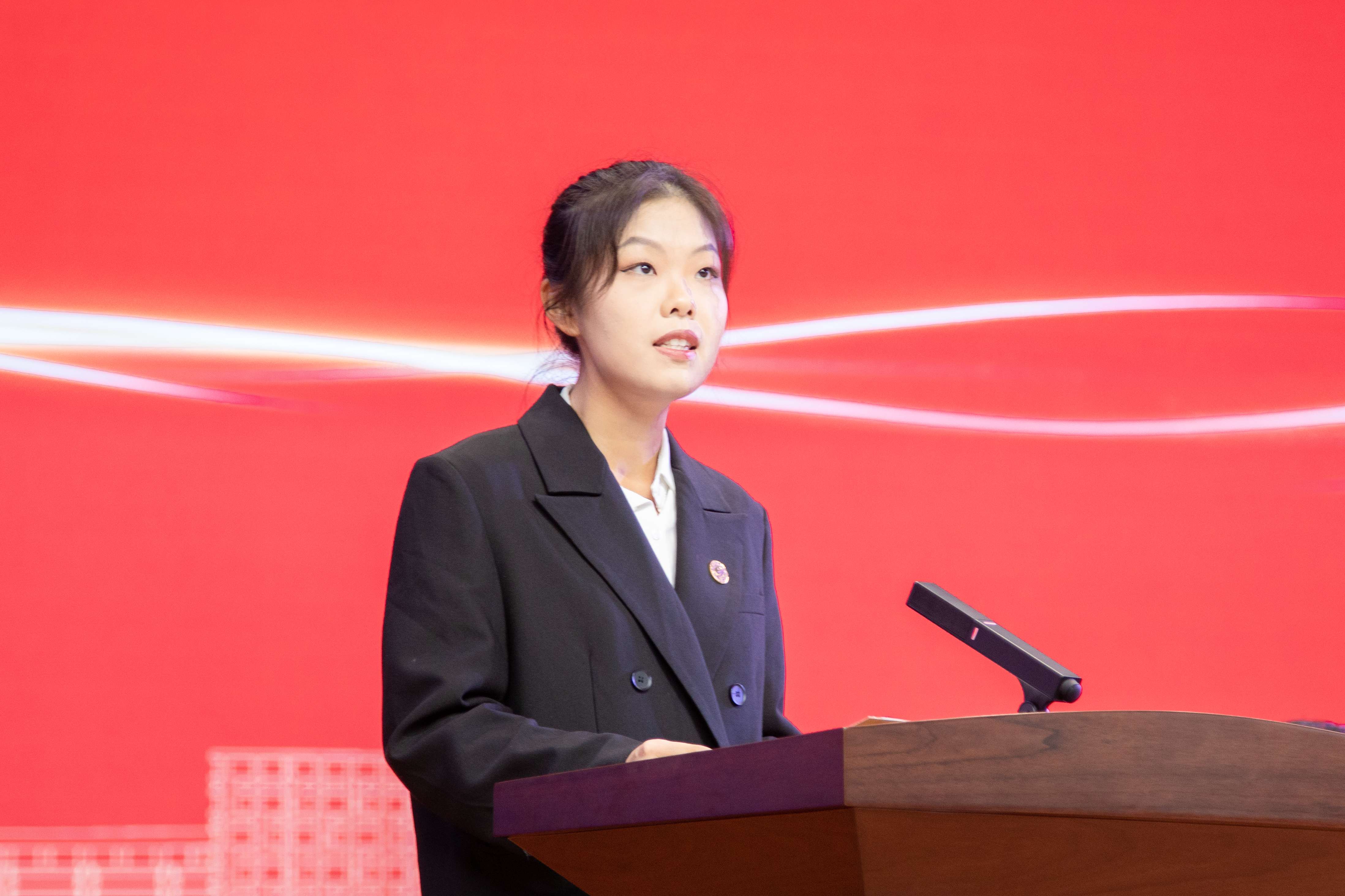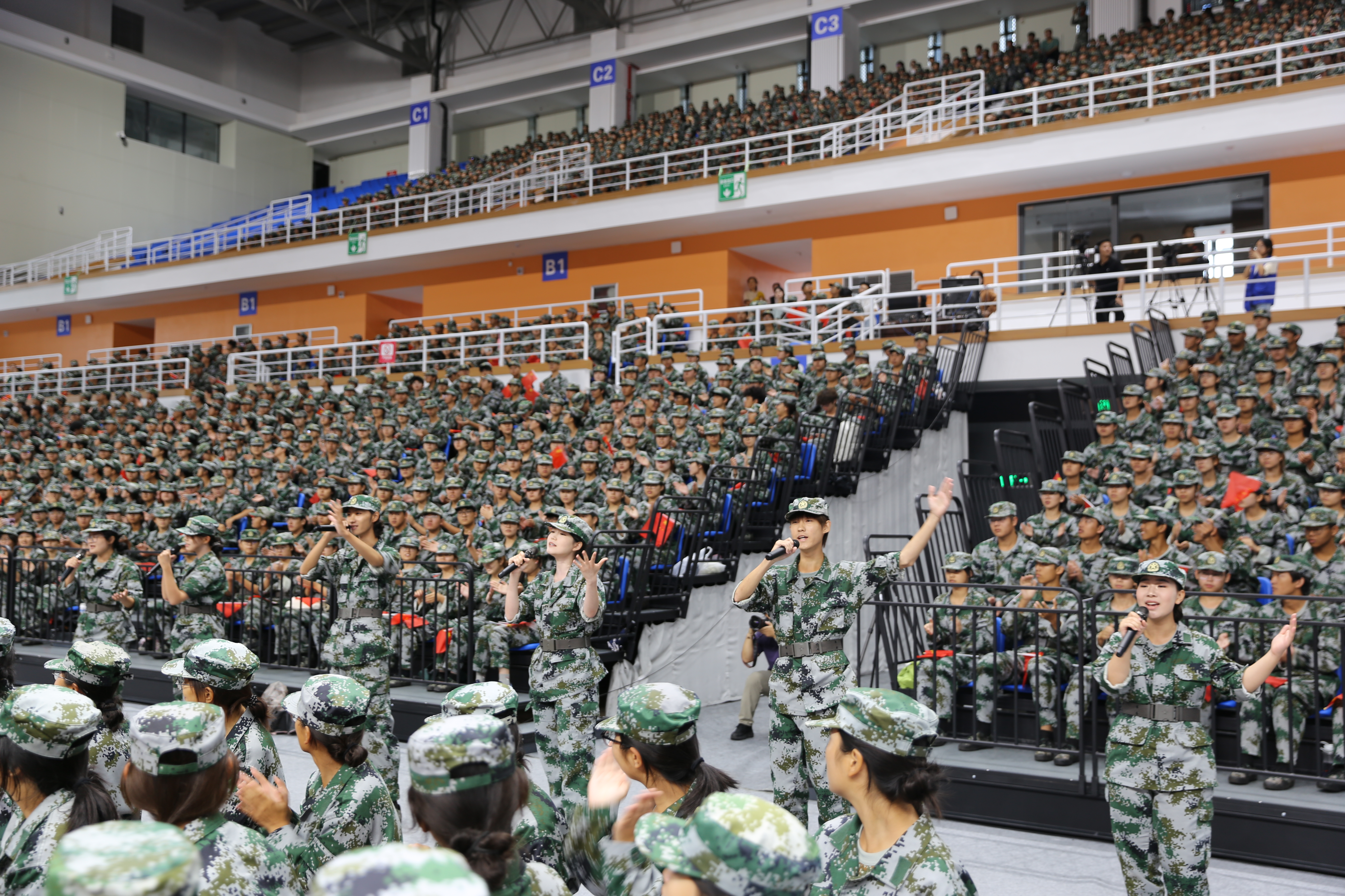 在掌声和瞩目中,教师代表和新生代表动情演唱了歌曲《我喜欢》《追梦赤子心》。全场新生随着音乐节拍挥动旗帜,青春的气息在大礼堂蔓延。