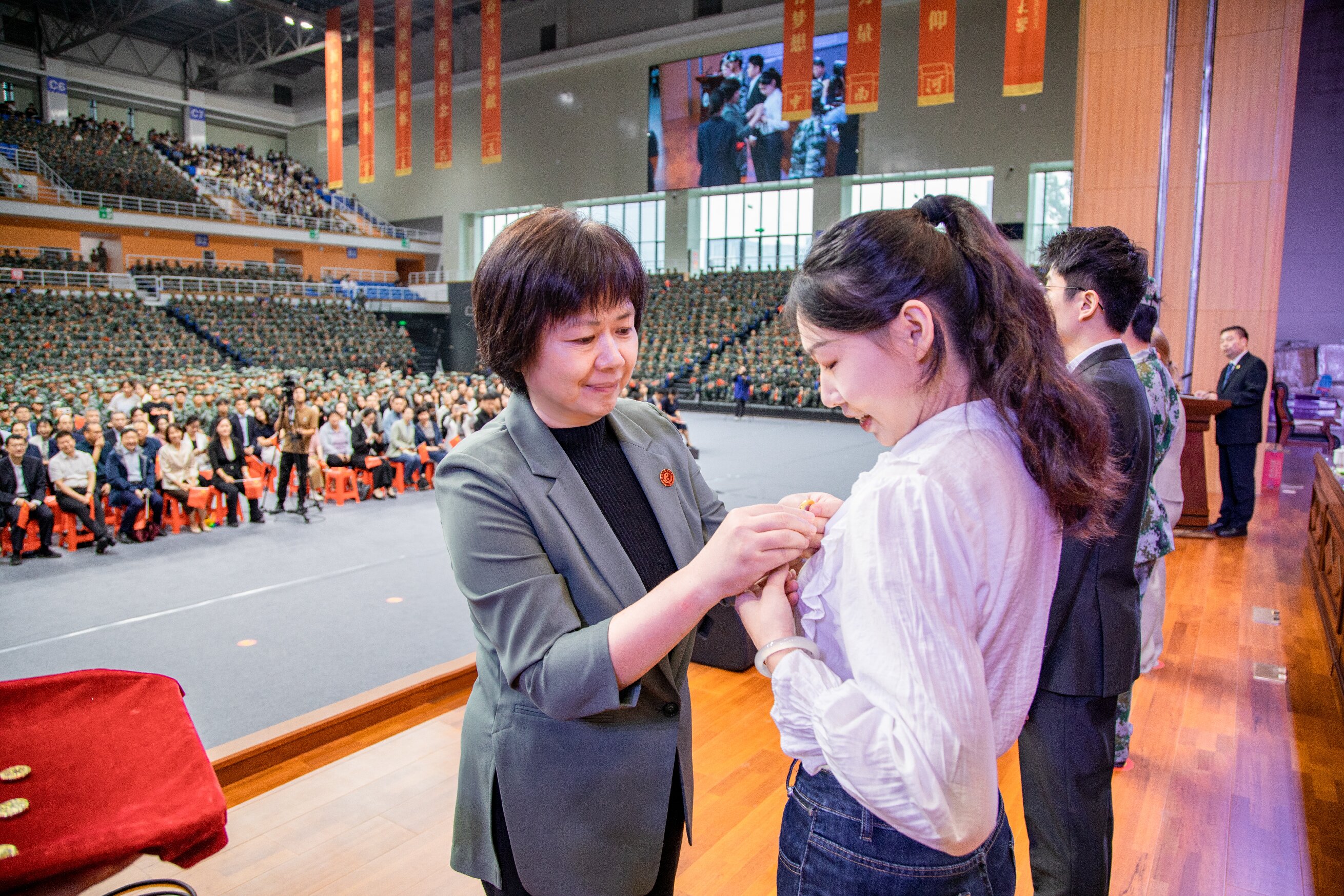 校党委书记李小芳为2025级新生代表颁授校徽