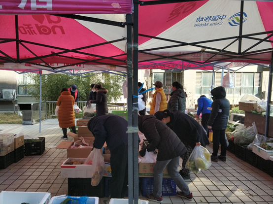 上午9点多,正是教职工买菜的高峰期,地下超市外的露天平台上,临时搭建的分销点前站满了购买蔬菜的教职工,超市的经理杨烁正在埋头称菜、算账,他是杨师傅的儿子。杨烁说,每天上午的9点至10点30分左右是超市的客流高峰,人流量大。因地下超市空气流通不好,易交叉感染,为了保障教职工的身体健康和生命安全,他们按照校产公司的要求对购物人员进行了分流,在楼上平台搭建帐篷,并将购菜地点从地下超市移至空气流通好的室外,尽管人手不够、有点冷,但在一定程度上避免了职工在购物、结账时出现拥挤现象,进而避免了人与人之间交叉感染的风险,这样做也值。