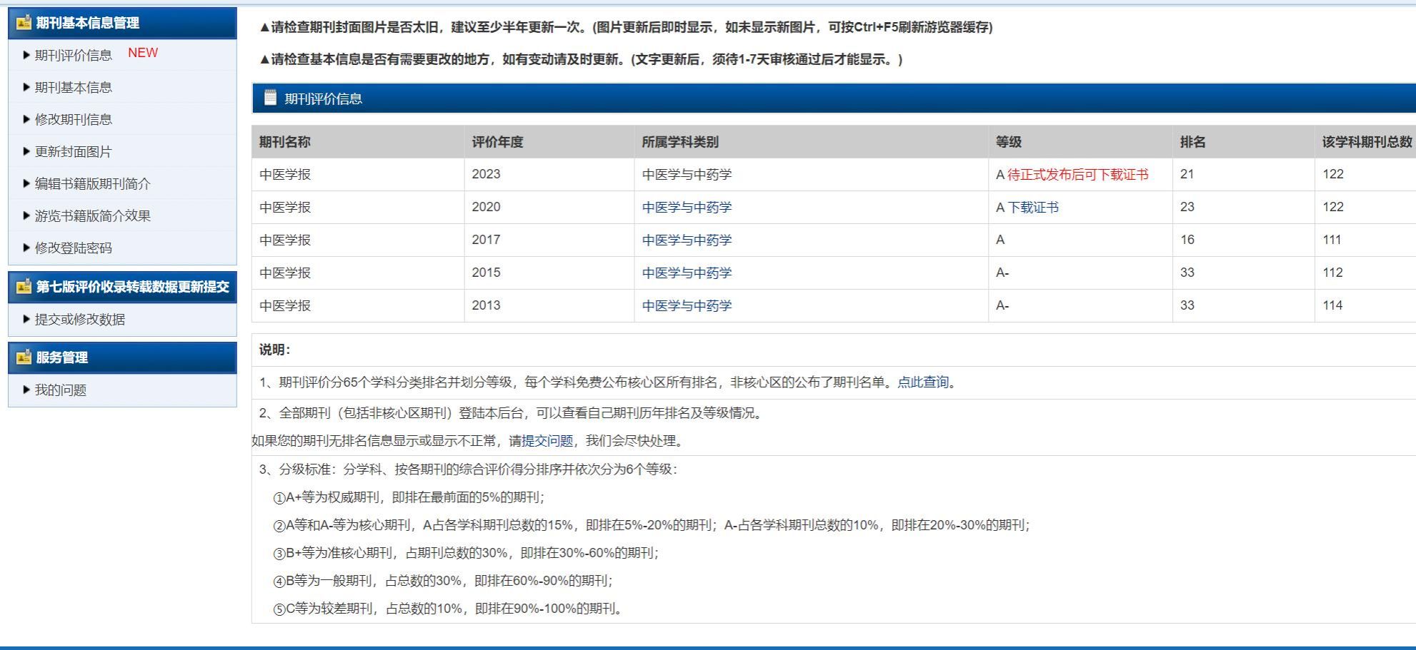 近日,杭州电子科技大学中国科教评价研究院、武汉大学中国科学评价研究中心、武汉大学图书馆、中国科教评价网联合发布“中国学术期刊评价研究报告(第七版)”,《中医学报》继续入选“RCCSE中国核心学术期刊”之“中文核心学术期刊(A)”,在122种中医学与中药学类学术期刊中排名第21位。这是本刊连续第3次入选“中文核心学术期刊(A)”。