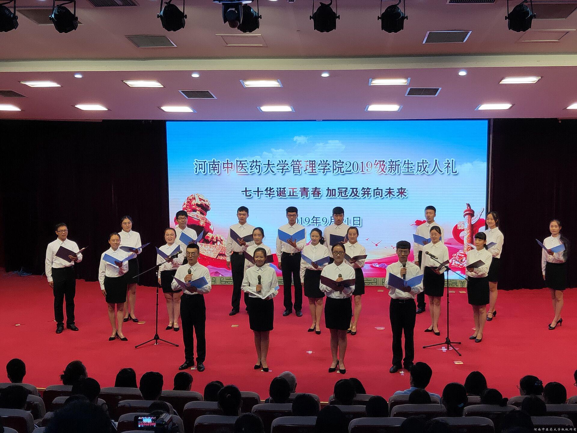 管理学院院长张丽青表达了对新生的殷切期盼,她表示,希望新同学们积极响应习近平总书记的号召,树立远大理想、不忘初心使命,常怀爱国之志、胸怀感恩之心,勇担社会责任、练就过硬本领,用积极的行动去拥抱美好的明天。管理学院军训教官邱世宁对我院新生军训工作圆满结束表示祝贺,并希望同学们能够将军人品质带入日常学习生活。管理学院2019级新生代表刘幸禄带来了朗诵表演《我的梦、中国梦》,向新中国成立70周年送上了美好祝福,表达了她对大学生活的美好憧憬,并号召大家要认清自己的责任与使命,做好规划,不负韶华。