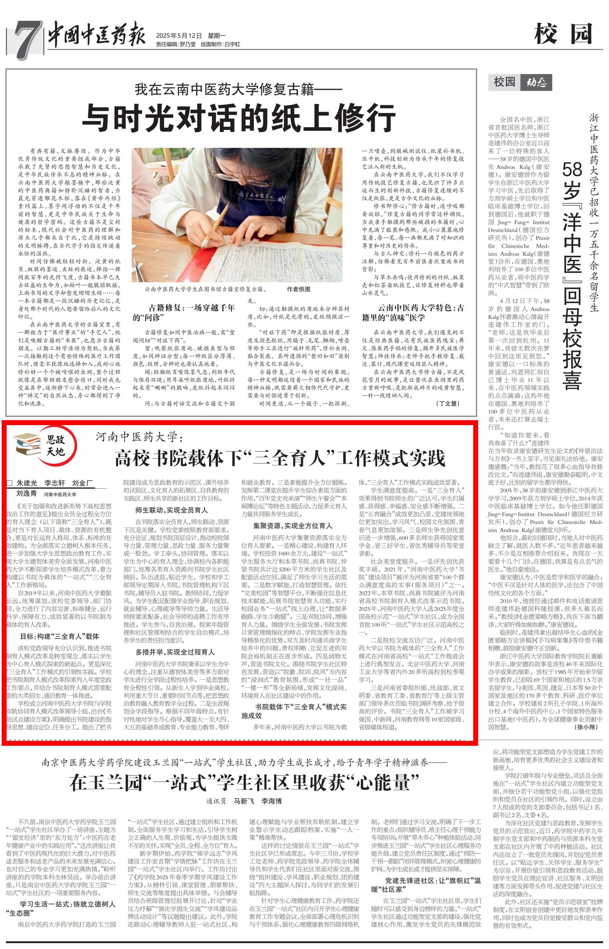 乐鱼leyu(中国)集聚资源落实全方位育人要素。一是精心建设,构建育人环境。学校投资1000余万元,建设“一站式”学生服务大厅和本草书院、尚真书院、仲景书院共计近5200平方米的学生社区及配套活动空间,满足了师生学习生活的需要。二是数字赋能,打造智慧管理。依托“完美校园”等智慧平台,不断强化信息化技术赋能,拓展书院智慧育人功能,实行校园业务“一站式”线上办理,让“数据多跑路、学生少跑腿”。三是双院协同,增强育人力量。围绕学生全面发展,书院发挥日常管理精细化的特点、学院发挥专业指导更加精准的优势,双方及时沟通共商学生培养中的问题,责权明晰、互促互进的双院会商机制正在逐步形成。四是润物无声,营造书院文化。围绕书院学生社区特色发展,营造以“院徽、院训、院风”为内容的“浸润式”教育氛围,形成“一社一品”“一楼一形”等全新场域,发挥文化浸润、环境育人在社区建设中的作用。