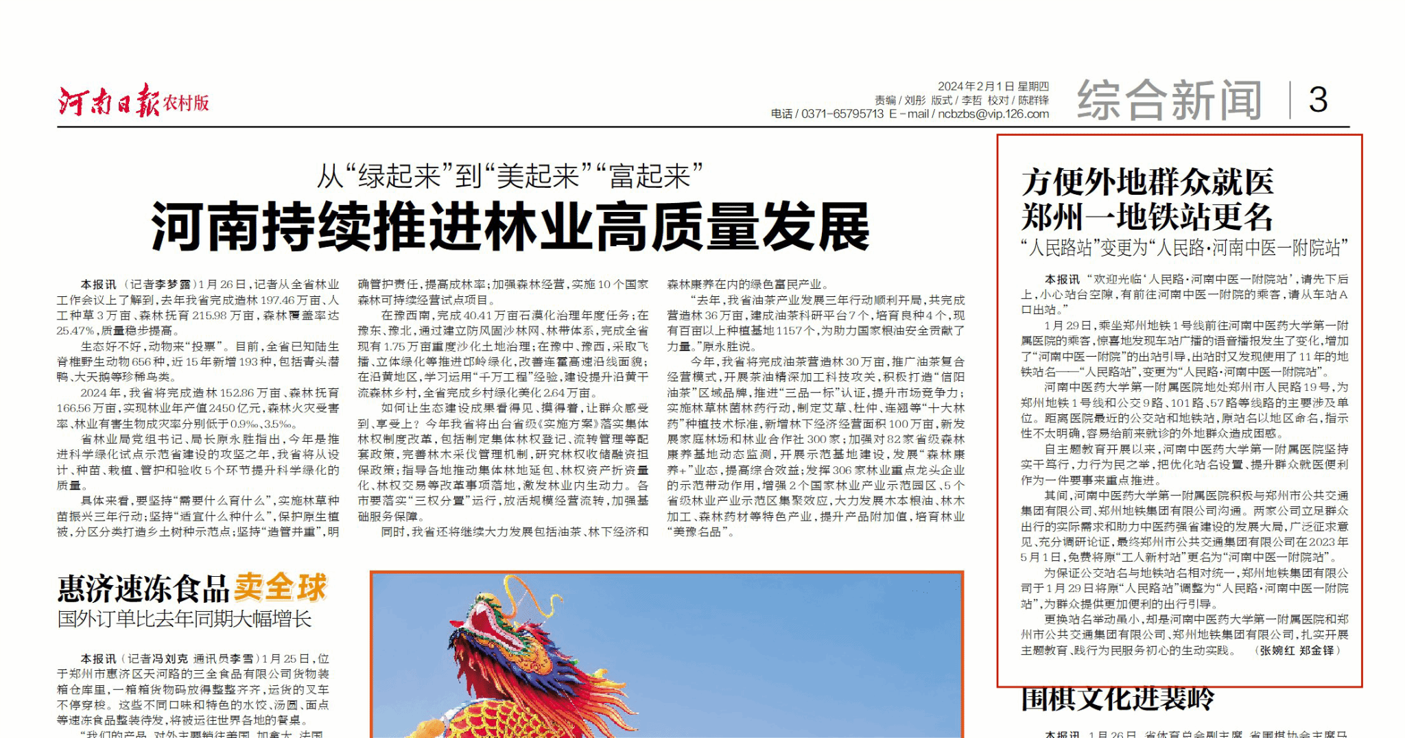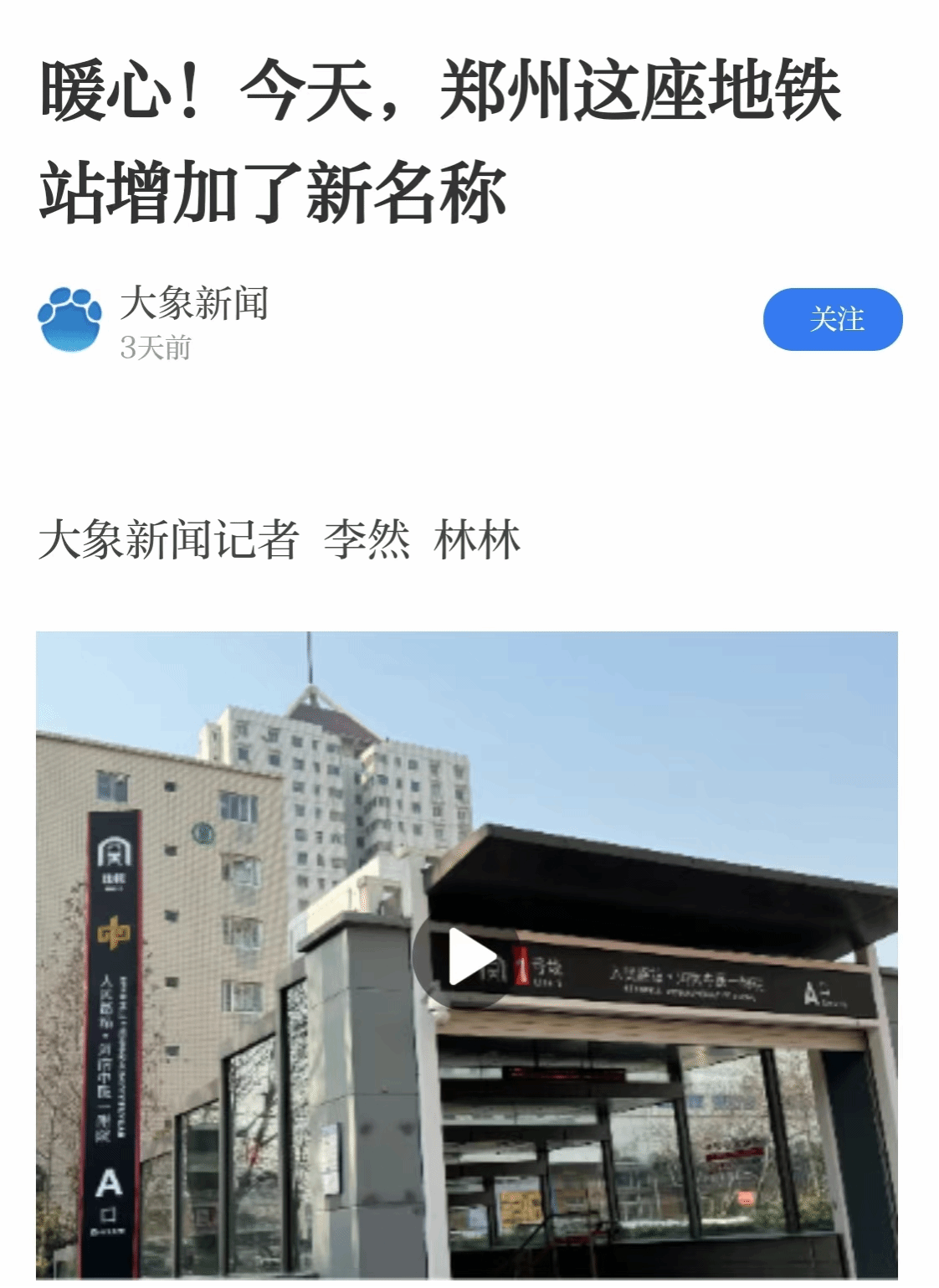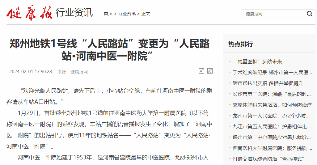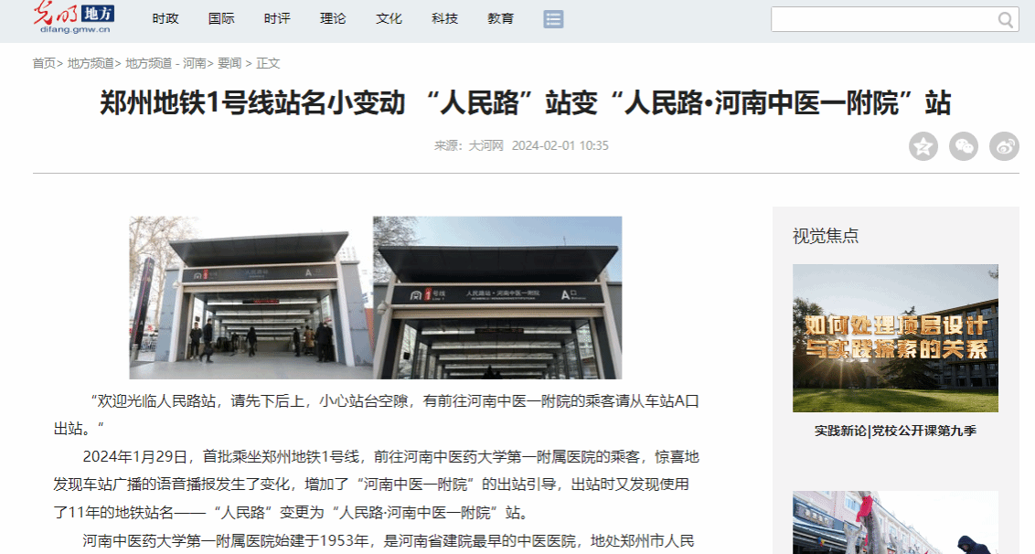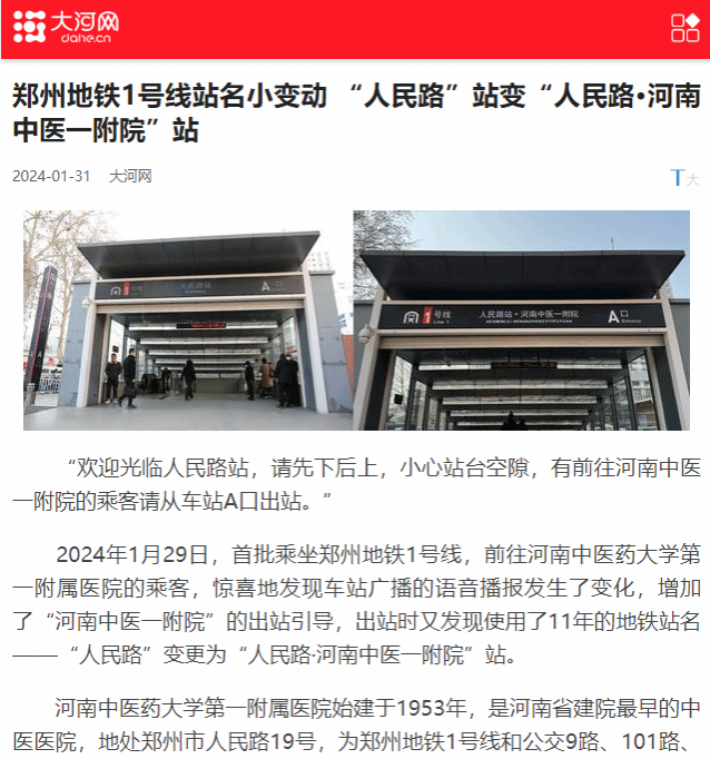 河南日报等丨郑州地铁1号线“人民路站”变更为“人民路站·河南中医一附院”