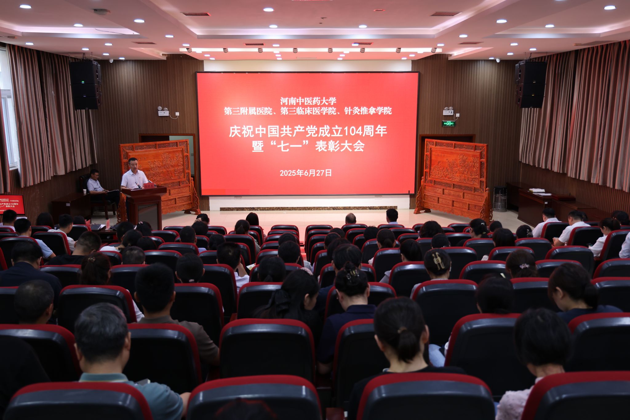 本网讯(文/李羚 图/田辉 潘向昆)2025年6月27日,三附院庆祝中国共产党成立104周年暨“七一”表彰大会在学术活动中心举行。在郑院领导、基层党组织书记、全体中层干部及护士长、党员代表、受表彰代表等参加大会。