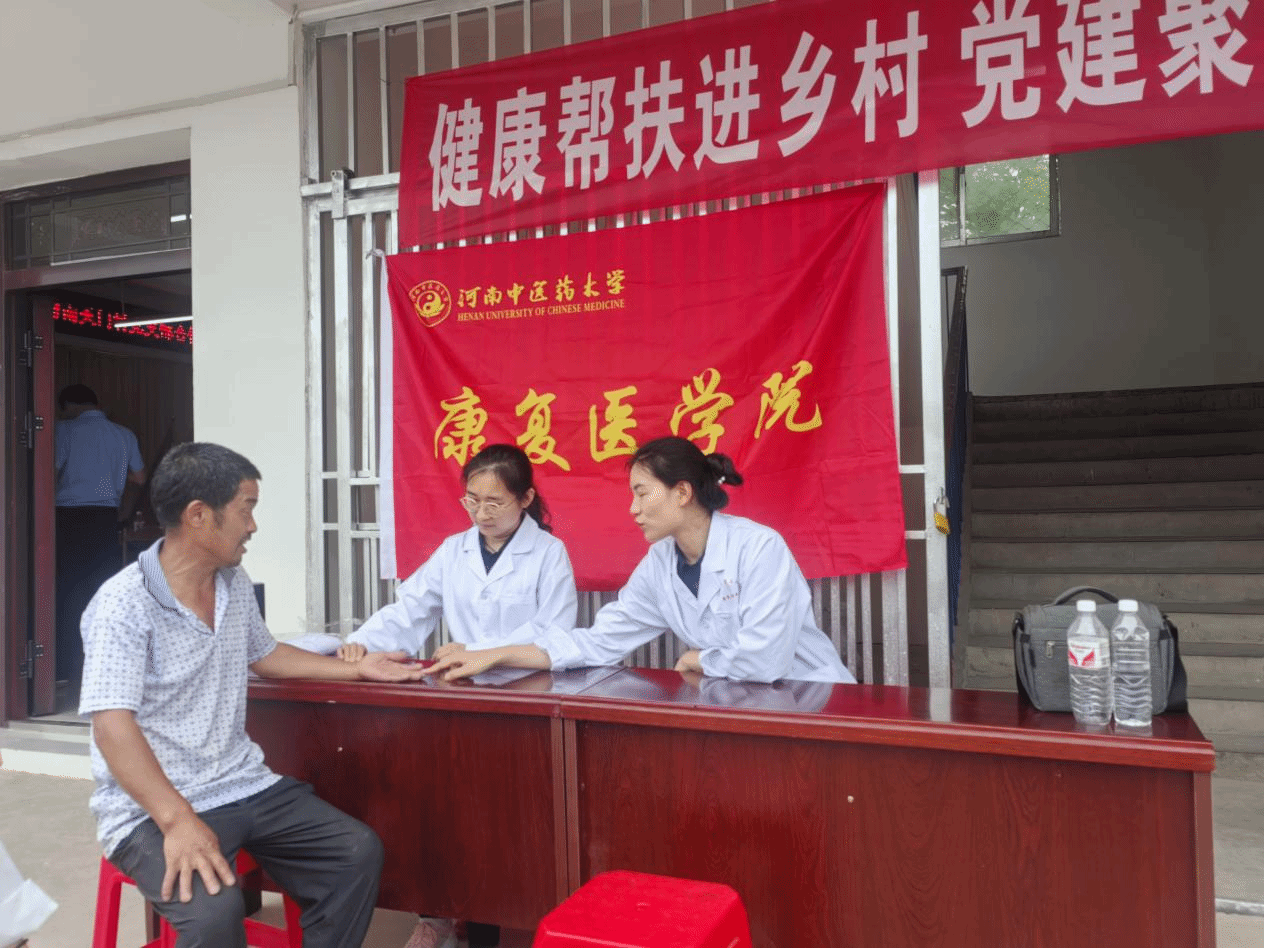 上午,团队一行首先抵达固始县南天门村,为当地村民提供免费健康义诊服务。活动现场,师生一起发挥专业特长,通过中医问诊、把脉、康复评定、治疗等方式,为村民诊治常见病、慢性病,给予个性化健康指导。师生郭宇、朱珂还向村民普及中医药养生知识,倡导科学防病理念。其中,学生党员积极参与志愿服务,协助测量血压、登记信息,展现了新时代医学生的责任担当。