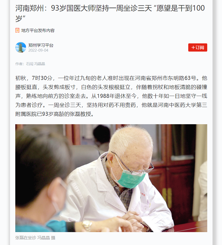 近日,学习强国郑州学习平台以《河南郑州:93岁国医大师坚持一周坐诊三天 “愿望是干到100岁”》为题,对国医大师张磊教授的事迹进行了报道。