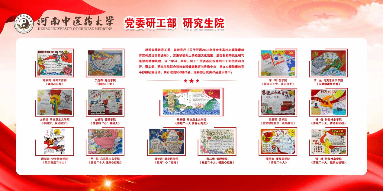 本网讯(文图/于嘉明)丹青溢彩歌盛世,翰墨飘香绘华章。根据省委教育工委、省教育厅《关于开展2022年度全省高校心理健康教育宣传周活动的通知》要求,为了营造积极向上的校园文化氛围,展现乐鱼官方端网站登录入口研究生朝气蓬勃的精神风貌,进一步学习宣传贯彻党的二十大精神,乐鱼官方端网站登录入口研工部、研究生院联合心理健康教育与咨询中心,于近日举办了心理健康教育手抄报征集活动。