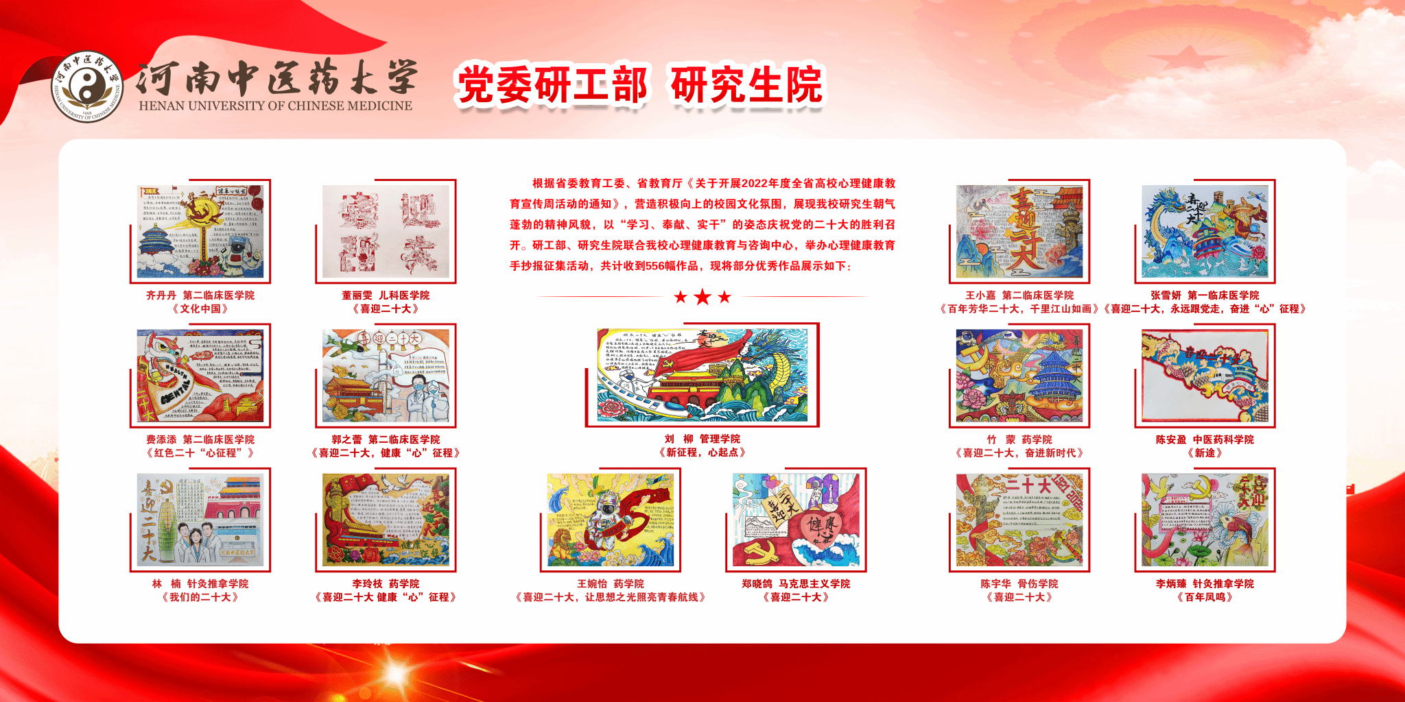 自活动开展以来,共计收到560余作品。最终,管理学院刘柳等3名同学获得一等奖,第一临床医学院刘杨等9名同学获得二等奖,护理学院王慧欣等18名同学获得三等奖,第二临床医学院刘沛沛等36名同学获得优秀奖。
