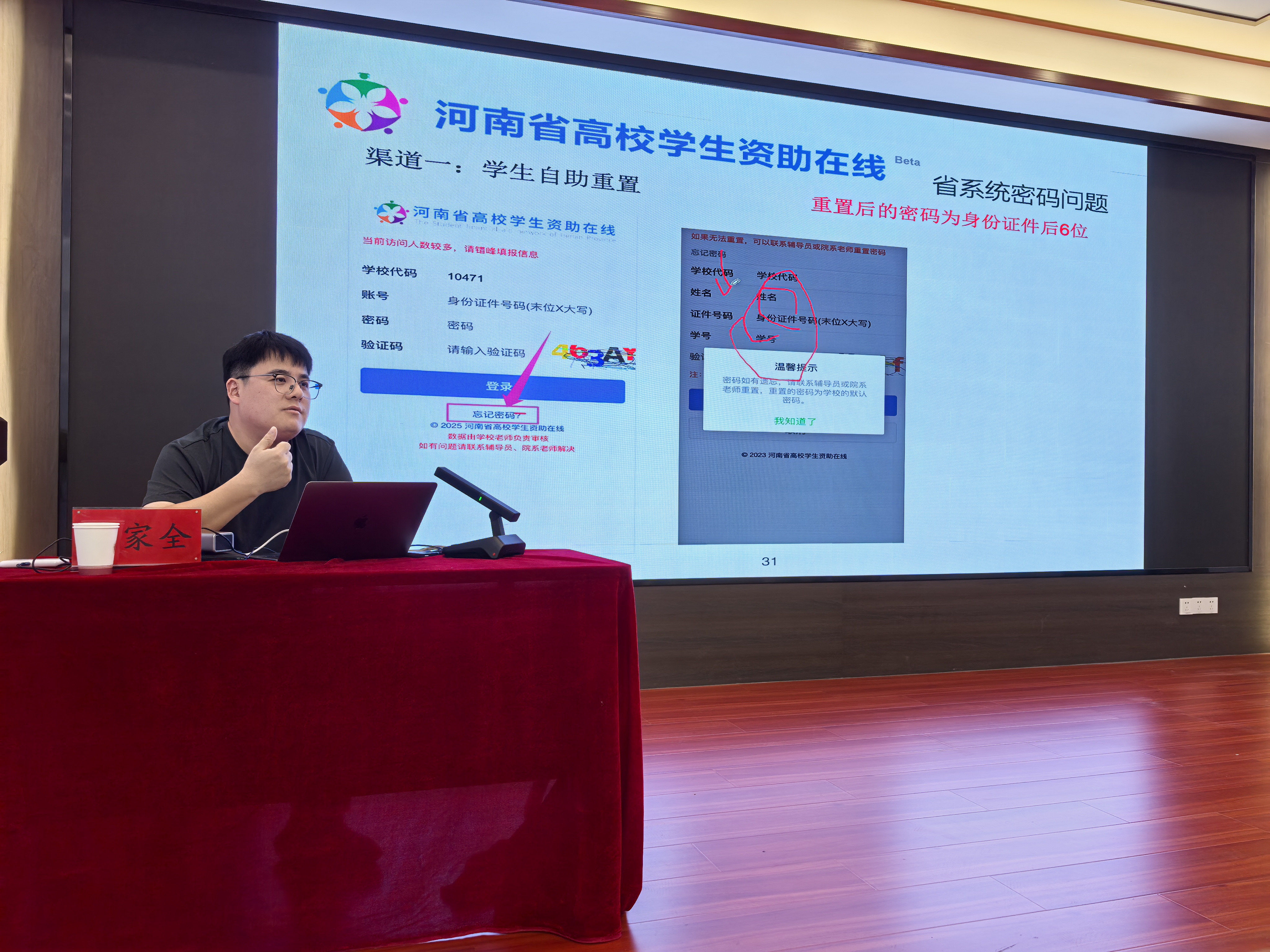 本网讯(文/图 吴明明)为进一步提升乐鱼官方端网站登录入口资助工作的规范化与精准化水平,近日,学生资助管理中心开展了多场次资助工作专题培训会,特邀河南开放大学资助中心主任雷江涛、河南省学生资助中心工程师何家全来校开展培训,各学院、书院资助专员、学贷专员、辅导员及学生助理参与了培训。