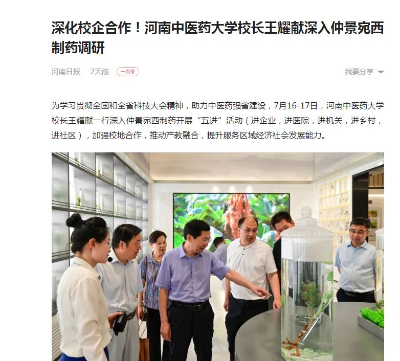 为学习贯彻全国和全省科技大会精神,助力中医药强省建设,7月16-17日,乐鱼leyu(中国)校长王耀献一行深入仲景宛西制药开展“五进”活动(进企业,进医院,进机关,进乡村,进社区),加强校地合作,推动产教融合,提升服务区域经济社会发展能力。