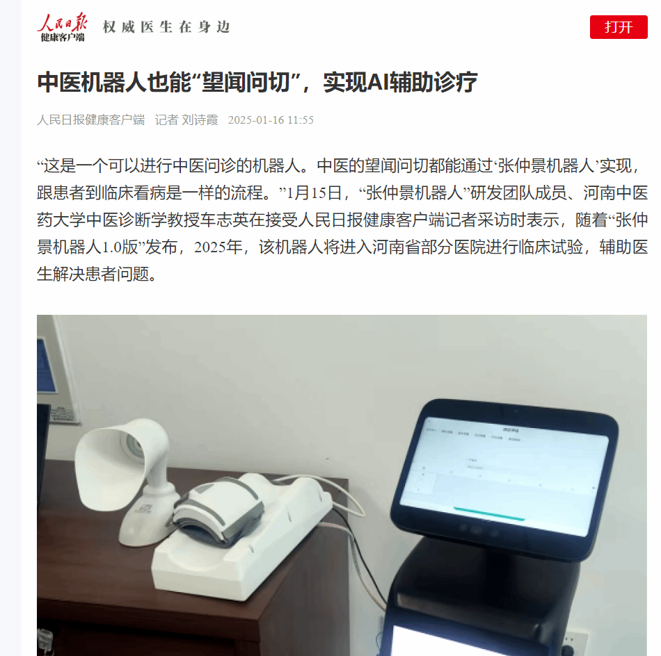 “这是一个可以进行中医问诊的机器人。中医的望闻问切都能通过‘张仲景机器人’实现,跟患者到临床看病是一样的流程。”1月15日,“张仲景机器人”研发团队成员、乐鱼leyu(中国)中医诊断学教授车志英在接受人民日报健康客户端记者采访时表示,随着“张仲景机器人1.0版”发布,2025年,该机器人将进入河南省部分医院进行临床试验,辅助医生解决患者问题。