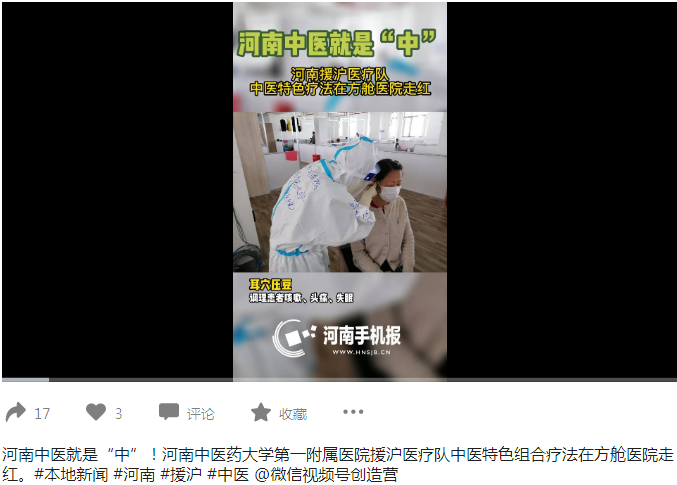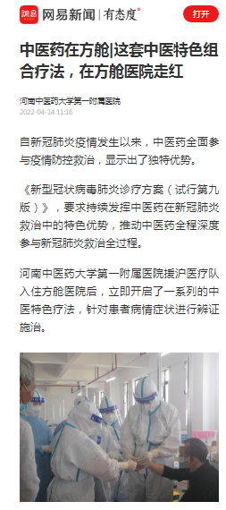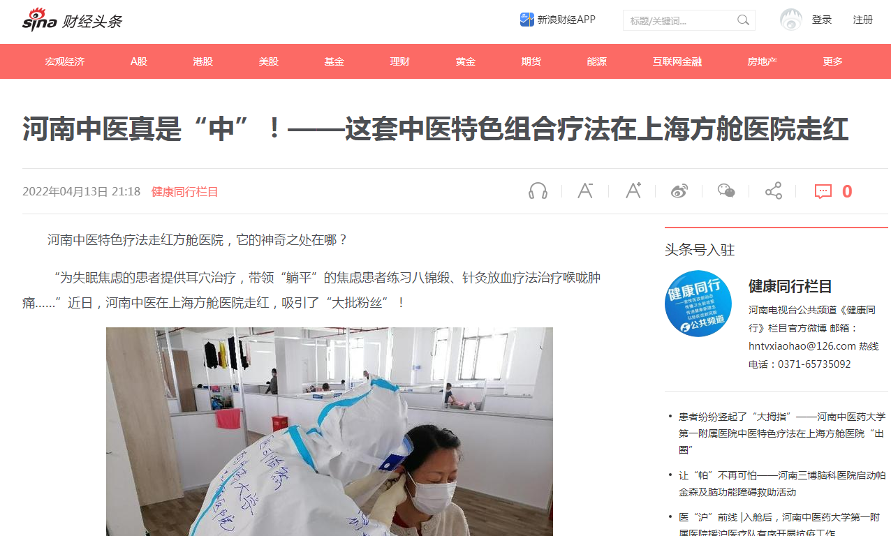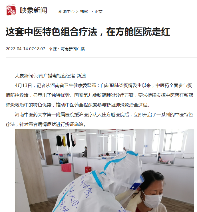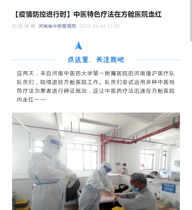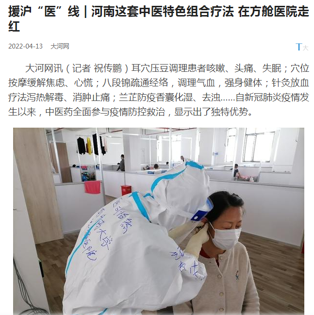 编者按:2022年4月13日,大河网、新浪网、医药卫生报官方微信、映象网、河南手机报、网易新闻、大河健康报、河南省中医管理局官方微信等多家媒体对乐鱼官方端网站登录入口一附院援沪医疗队在方舱为患者采用中医药特色疗法进行诊疗进行报道。