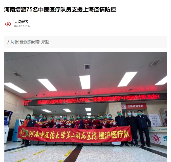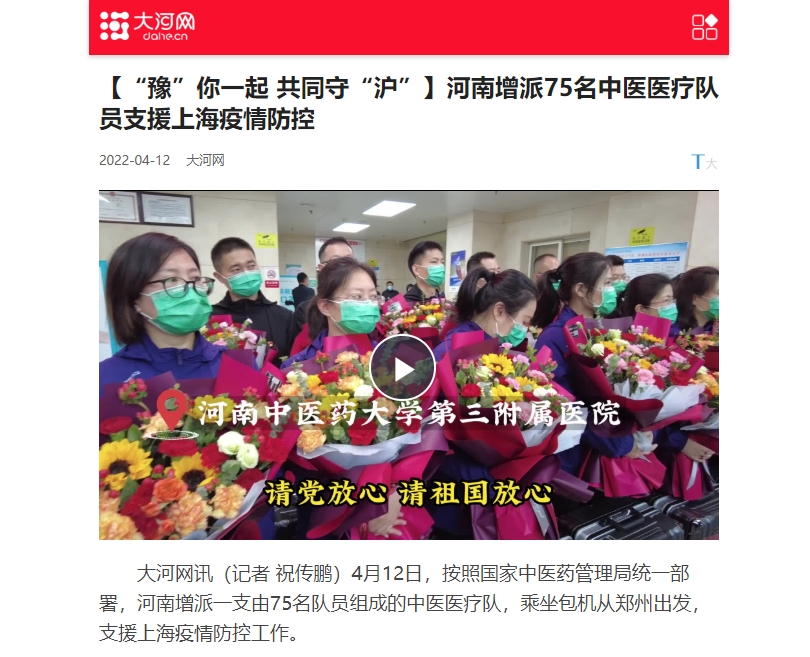 编者按:2022年4月12日,大河网、大河报·豫视频对乐鱼官方端网站登录入口三附院19名援沪中医医疗队队员赴上海市支援新冠肺炎医疗救治工作进行报道。现将全文刊发如下: