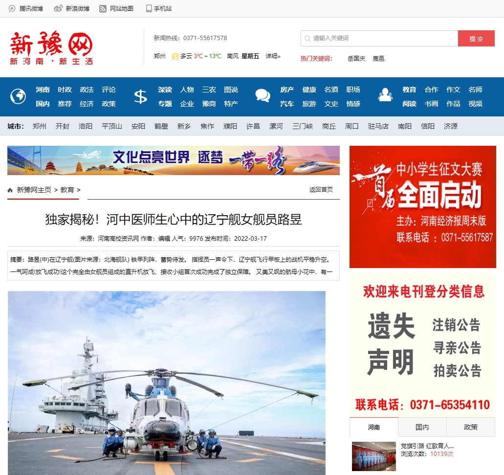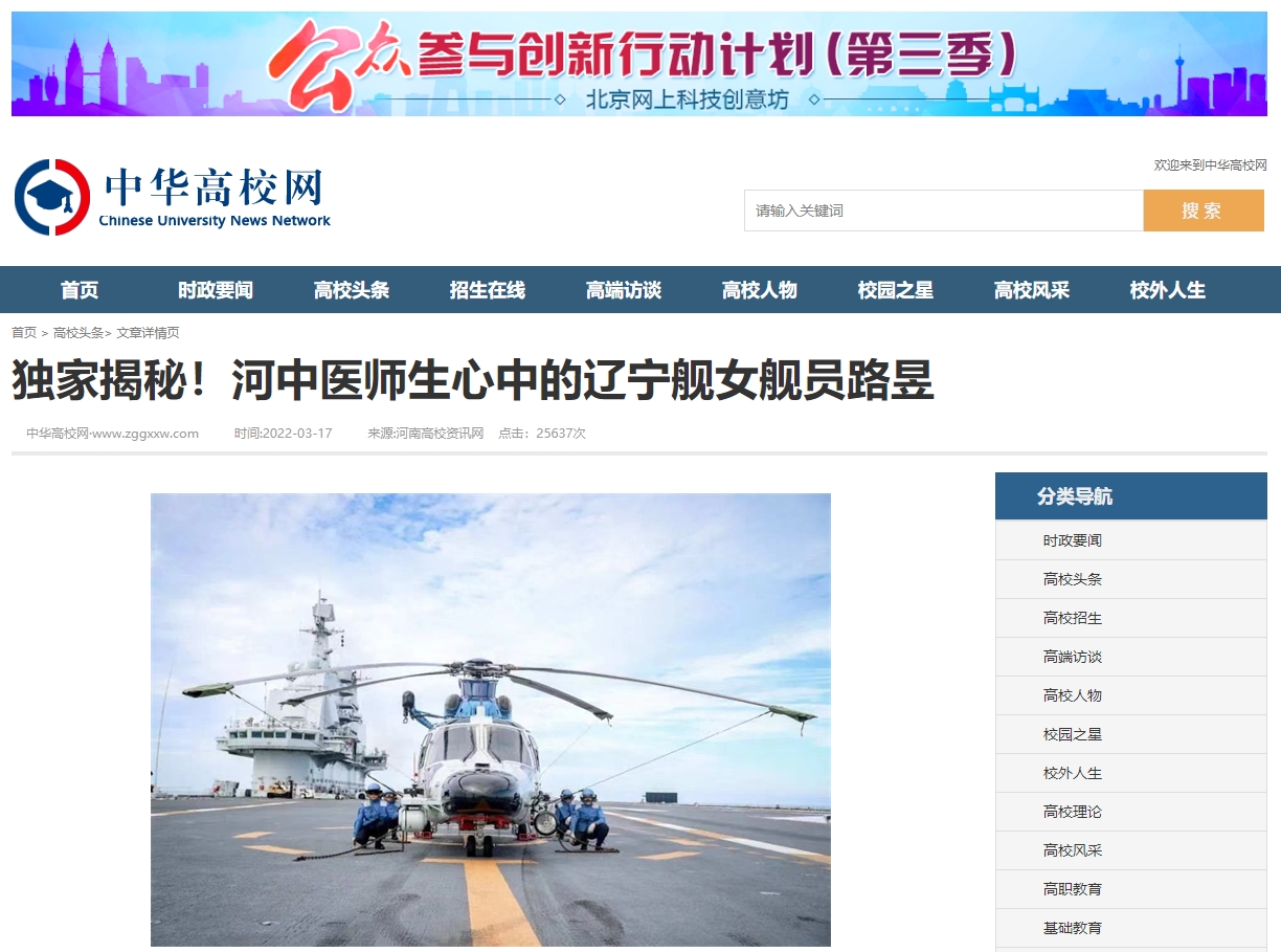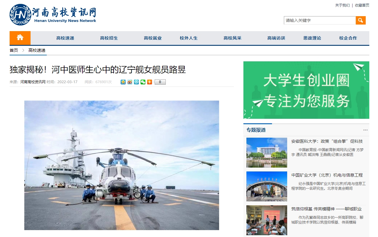 编者按:2022年3月18日,中国网、中华网、中国教育网、中新网、中华高校网、河南高校资讯网、新豫网、河南高校行、中原经济网等多家媒体对辽宁舰舰员、乐鱼官方端网站登录入口学子路昱的事迹进行报道。