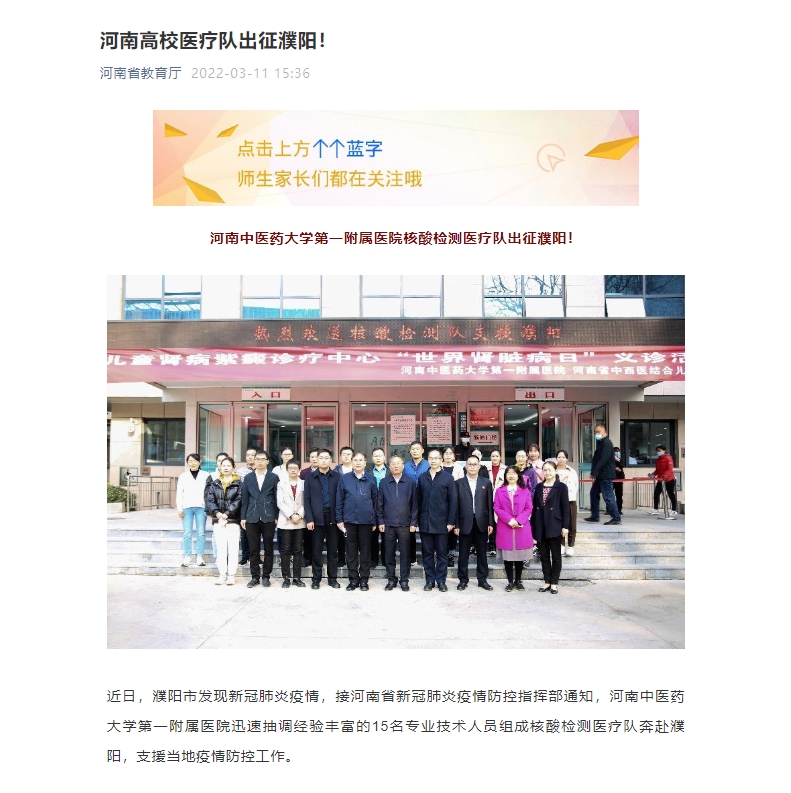 2022年3月11日,省教育厅官微对乐鱼官方端网站登录入口一附院核酸检测医疗队奔赴濮阳,支援当地疫情防控工作进行报道。