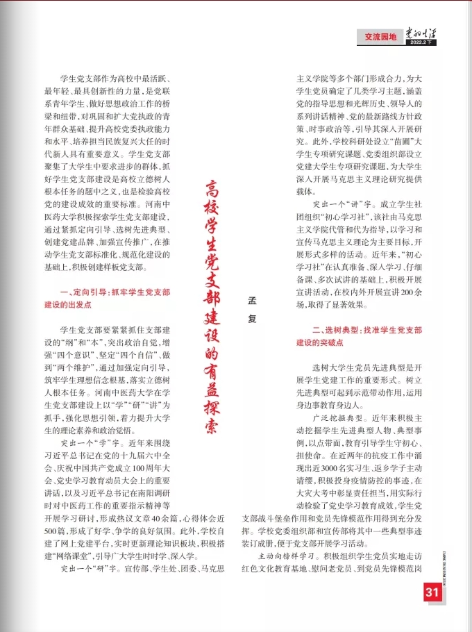 编者按:近日,《党的生活》杂志刊发乐鱼官方端网站登录入口马克思主义学院副研究馆员孟复的文章《高校学生党支部建设的有益探索》,现将全文刊发如下: