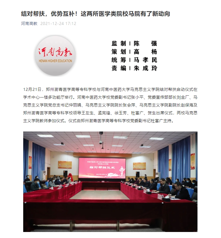 编者按:2021年12月24日,河南高教对乐鱼官方端网站登录入口马克思主义学院与郑州澍青医学高等专科学校结对帮扶启动仪式进行报道。现将全文刊发如下: