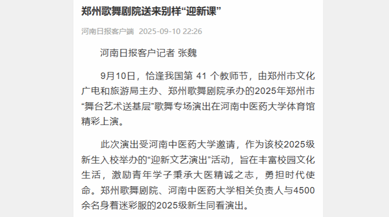 郑州歌舞剧院曾创作出《唐宫夜宴》《风中少林》《水月洛神》等广受好评的优秀作品,并多次代表中国参与国际文化交流。此次演出不仅是“舞台艺术送基层”文化惠民工程的深入实践,更是一堂 “文艺 + 思政” 的融合课,彰显了艺术教育在立德树人中的独特价值。