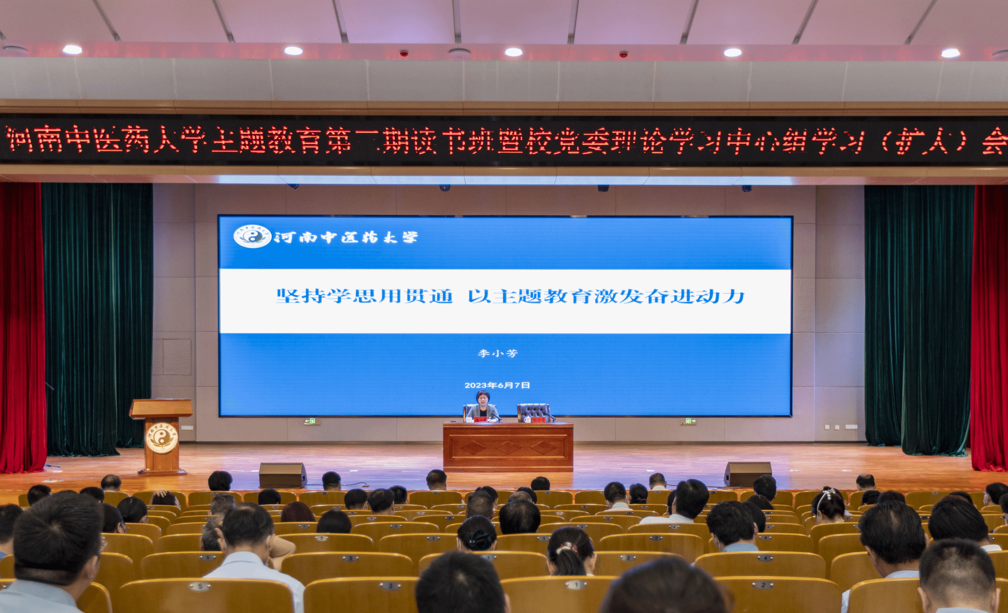 本网讯(文/王赞 图/郭寅虎)6月7日上午,学校主题教育第三期读书班暨校党委理论学习中心组学习(扩大)会在俊学实验综合楼A101报告厅举行。会上,党委书记李小芳以《坚持学思用贯通 以主题教育激发奋进动力》为题讲授专题党课。学校领导班子成员、中层干部参会,会议由党委副书记、工会主席张小平主持。