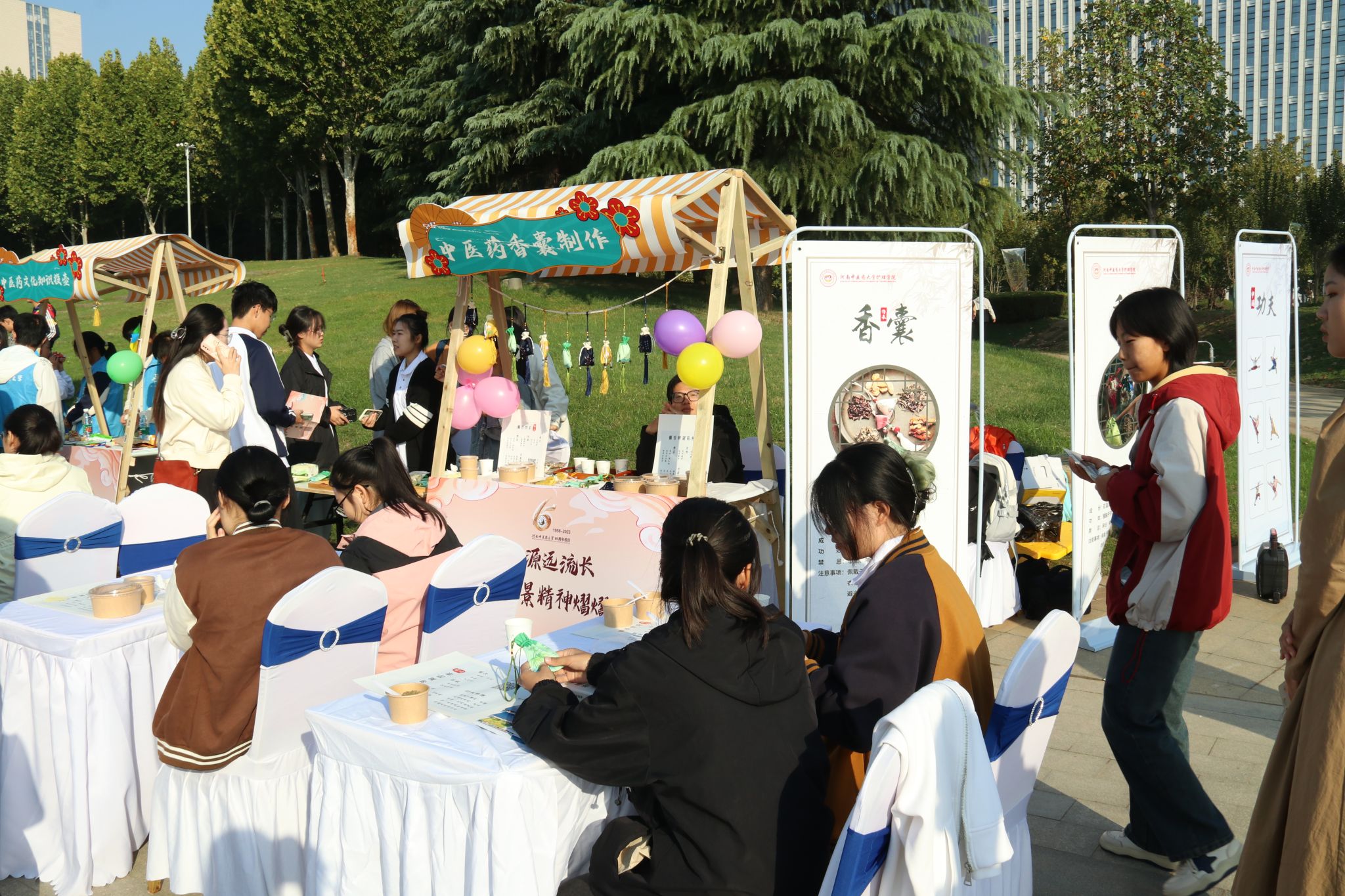 步入会场,只见众多摊位鳞次栉比,淡淡的中药香弥漫全场,仲景中原中医药文化体验街上,许多身着宋制或明制服饰的姑娘或细品养生茶,或巧手制作中药香囊,美眸顾盼间华彩流溢,红唇间漾着清淡浅笑。更有外国友人手执印有河中医校徽的团扇,近距离参与中医药谜语、中医药文化知识投壶等项目。目睹此景,我们俱能体会到中医药的魅力已经走进当代年轻人,乃至走向世界,中医药文化的创造性转化、创新性发展更加离不开青年一代的努力。