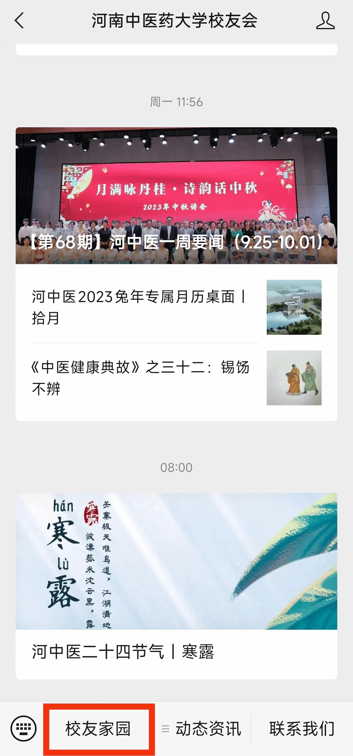 (二)点击微信公众号工具栏“校友家园”进入校友平台;
